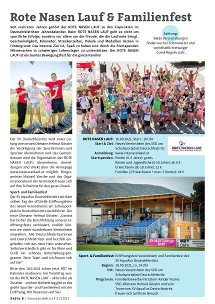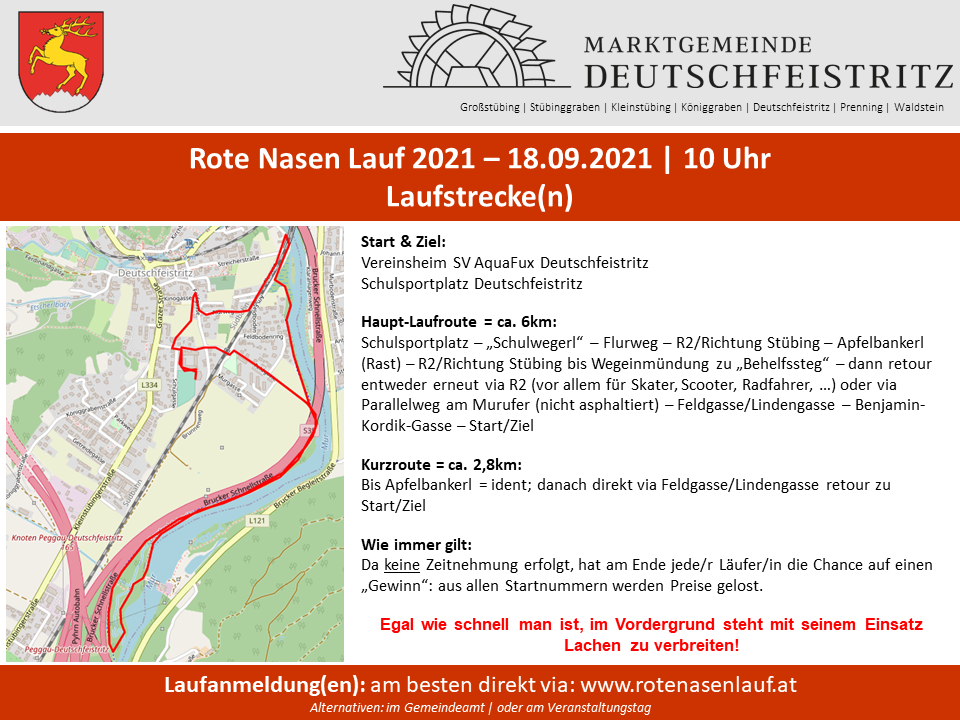 Die Marktgemeinde Deutschfeistritz veranstaltet im Jahr 2021 am Samstag, 18. September 2021 einen ROTE NASEN LAUF mit Start im Schulzentrum Deutschfeistritz um 10:00 Uhr. Nachnennungen und Startnummernausgabe sind ab 09:00 Uhr möglich.