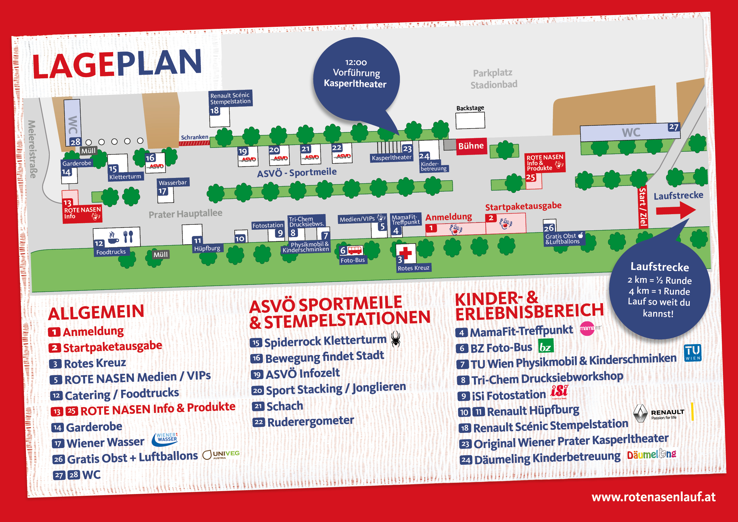 Welche Mitmachstationen unsere Sponsoren heuer für dich vorbereitet haben, bei wem du auf der ASVÖ-Sportmeile vorbeischauen kannst und wo du unsere Anmeldung am Lauftag findest, zeigt dir anbei unser Lageplan.
