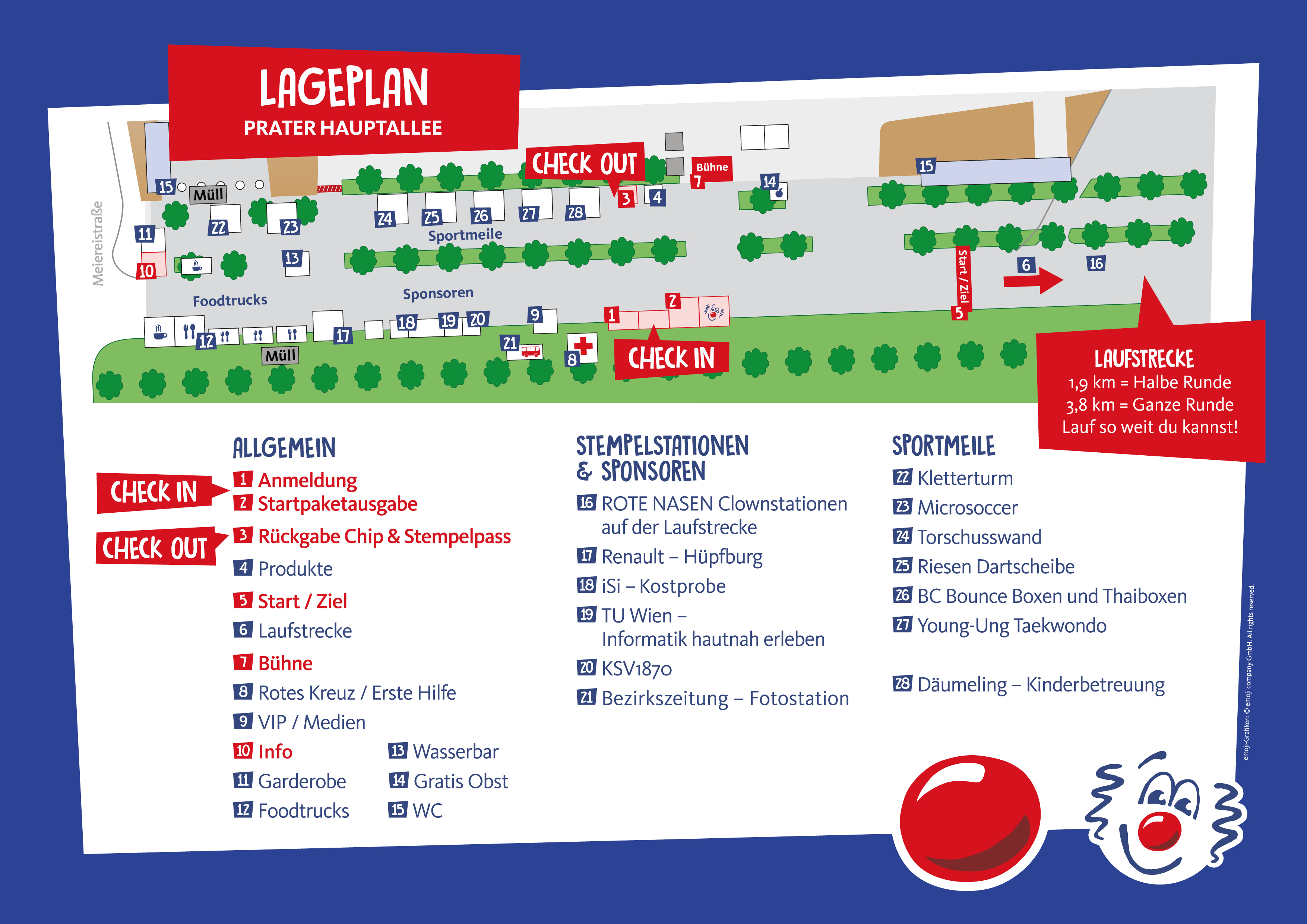 Die Laufstrecke ist ein Rundparcours auf der Prater Hauptallee und entweder 1,9 oder 3,8 Kilometer lang. Es können so viele Kilometer wie gewünscht zurückgelegt werden – je nach Lust und Laune. Du kannst laufend oder spazierend mitmachen, walkend, mit Ein-, Zwei- und Dreirad, mit Kinderwagen oder Rollstuhl, ganz egal. Beim ROTE NASEN LAUF ist alles möglich!