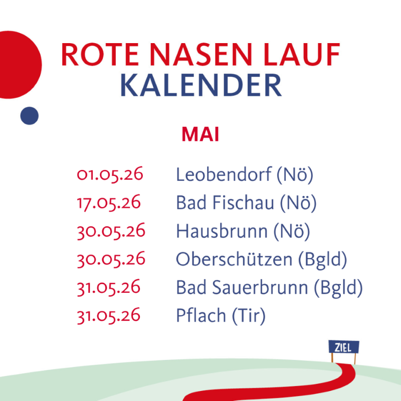 Gleich sechs ROTE NASEN LÄUFE finden im nächsten Monat statt. Und das in mehreren Bundesländern. Wir dürfen viele, fröhliche Läufer*innen im Burgenland und in Niederösterreich anfeuern. In Tirol gibt es ein großes Jubiläum: der 10. Pflacher ROTE NASEN LAUF!