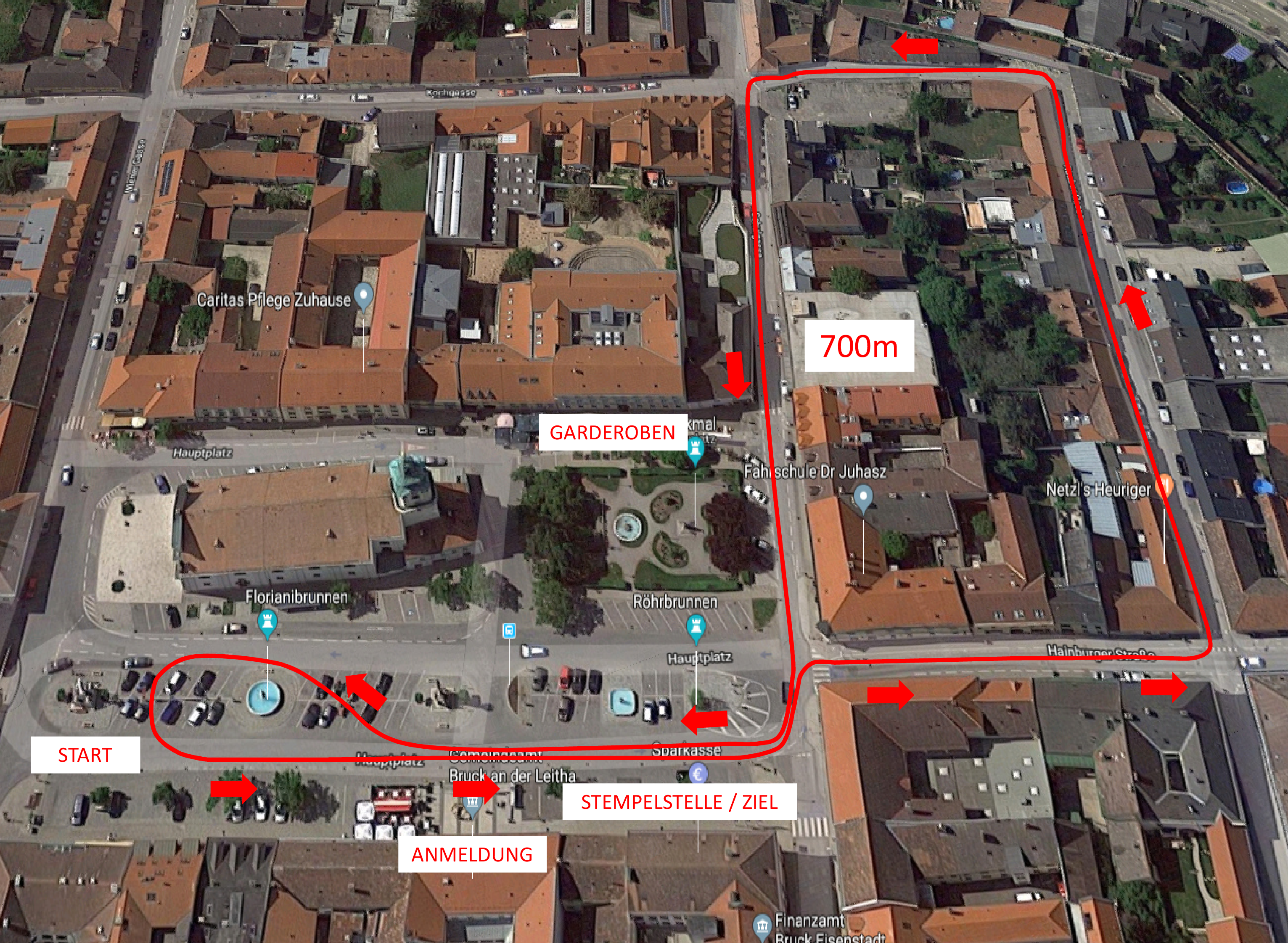 Die Laufstrecke . . . ist ca. 700m lang, es ist ein Rundkurs durch die Brucker Innenstadt. Start und Ziel ist am Brucker Hauptplatz vor dem  Brucker Rathaus.