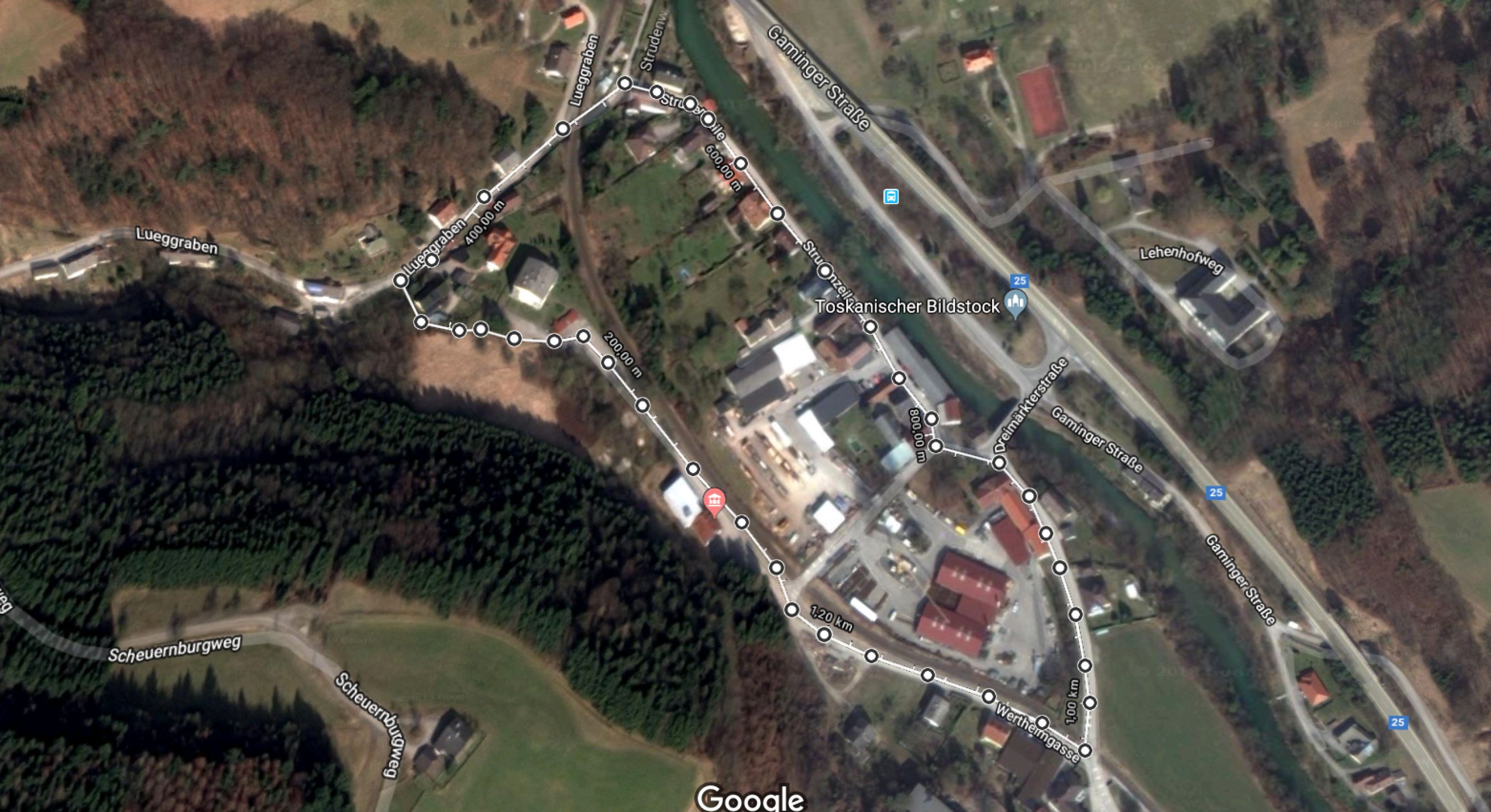 Start/Ziel der Runde befinden sich im Bereich der FF Neustift. Die Strecke führt vorbei an der FF Neustift zu einer Brücke über den Bach zur Lueggraben-Straße, über die Strudenzeile und Dreimärkterstraße (2. Abbiegung!!) wieder zurück. Rundenlänge: 1200m
