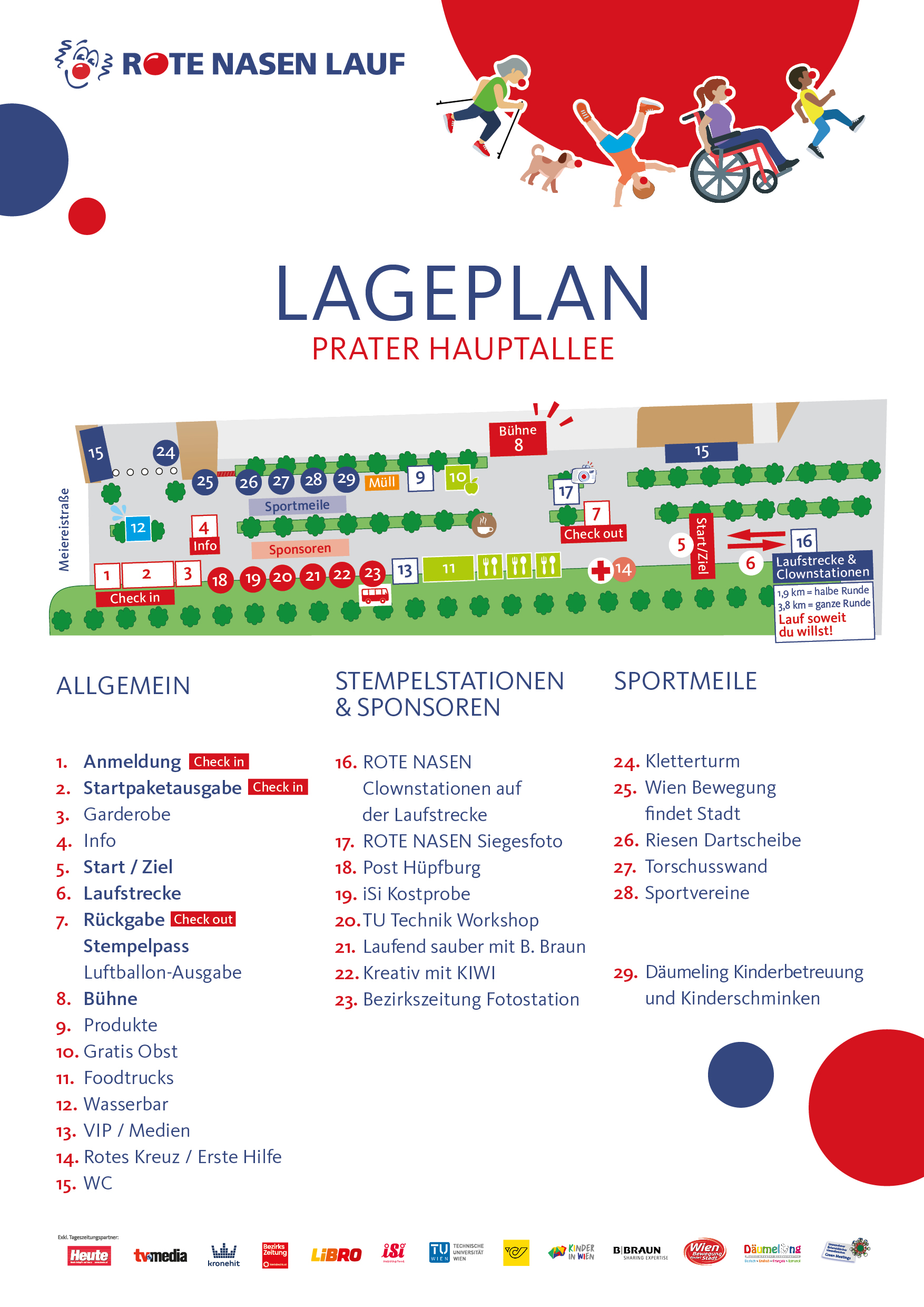 Das bunte Programm steht schon fest: CLOWNS, CLOWNS, CLOWNS! Mit dem Lageplan findest du dich beim ROTE NASEN LAUF auf der Prater Hauptallee zurecht.